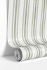 Sage Lineage wallpaper in kitchen with green and white stripes behind open shelving and ceramics