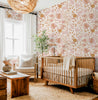 Wallpaper 1654: Warm nursery featuring blush and terracotta floral wallpaper with hand-drawn flowers, styled with natural wood crib, cream chair, and boho accents.