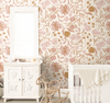Petal Pathway wallpaper adds a warm, whimsical vibe to any nursery or bedroom, showcasing hand-drawn florals in dusty pink, soft peach, and golden hues across a cozy neutral background.