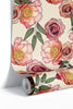 Rosy Rhapsody features vibrant roses and blooming peonies in shades of blush, fuchsia, and peach, accented with fresh green leaves. A dreamy floral mural perfect for romantic or bohemian interiors.