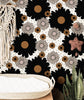 Dark Daisy – 381 brings bold retro charm with oversized black blooms, rust orange centers, and soft tan and blush petals scattered across a creamy ivory background. This wallpaper is perfect for statement walls in boho bedrooms, vintage-style living spaces, or eclectic interiors craving bold personality. Tiny diamond accents add a graphic edge to the floral arrangement, balancing playfulness with sophistication. Ideal for those who love maximalist design, warm tones, and eye-catching patterns that transform a room instantly.