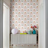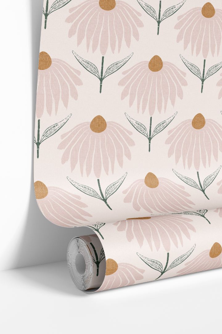 Petalline Blush Wallpaper – 2241 features softly rendered coneflower-inspired blooms arranged in an open, evenly spaced repeat across a blush-toned background with subtle linen texture. Pale pink petals surround warm golden centers, while muted sage green stems introduce gentle contrast without overpowering the design. The medium-scale pattern maintains visual interest while preserving a calm, cohesive appearance, making it well suited for bedrooms, nurseries, offices, and other interior spaces where a floral wallpaper is desired without feeling overly decorative or busy.