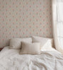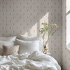 Rosette Arch Wallpaper behind white bedding with soft natural light and blush tones