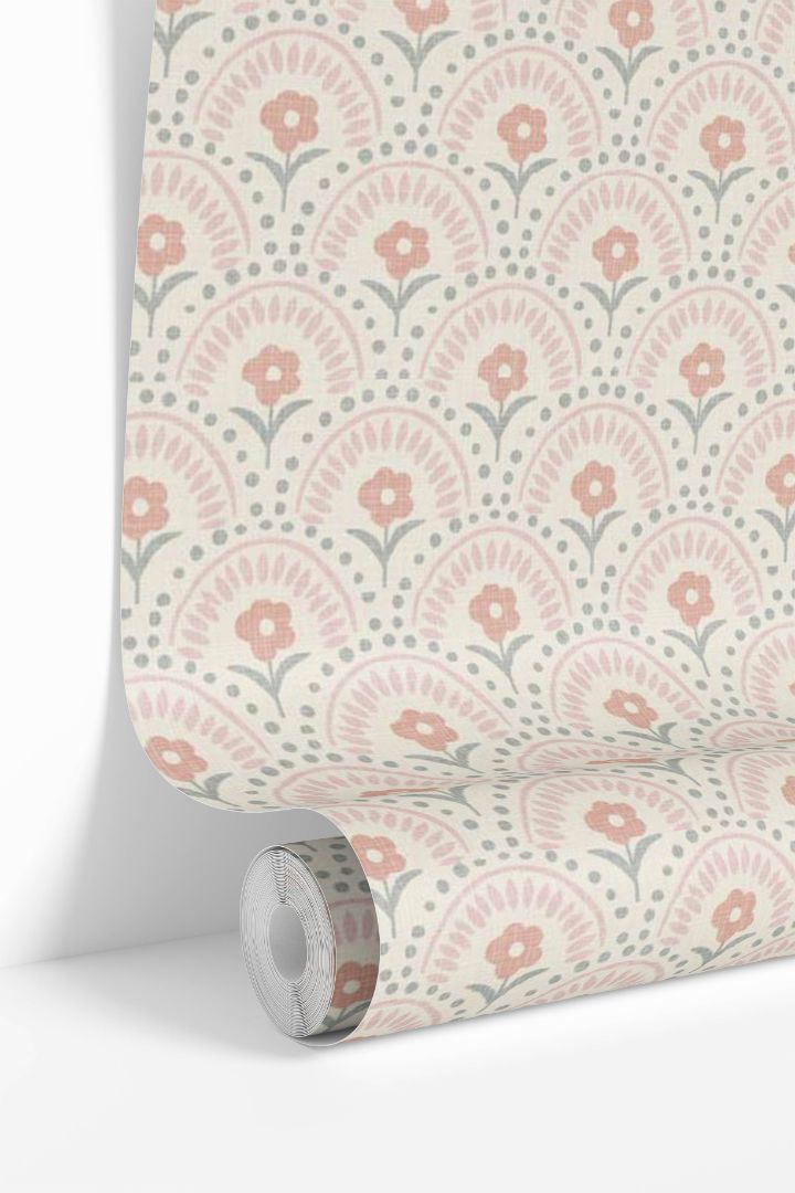 Rosette Arch Wallpaper – 2175 blends vintage charm with modern softness, featuring blush pink floral medallions framed within graceful arch motifs. The delicate gray stems and muted cream backdrop create a soothing and timeless aesthetic that brightens any room with quiet elegance. Ideal for bedrooms, nurseries, or cozy dining spaces, this wallpaper adds a hint of pattern without overwhelming the space. Its gentle hues pair beautifully with warm wood, ivory linens, and minimal décor for a fresh, inviting look.